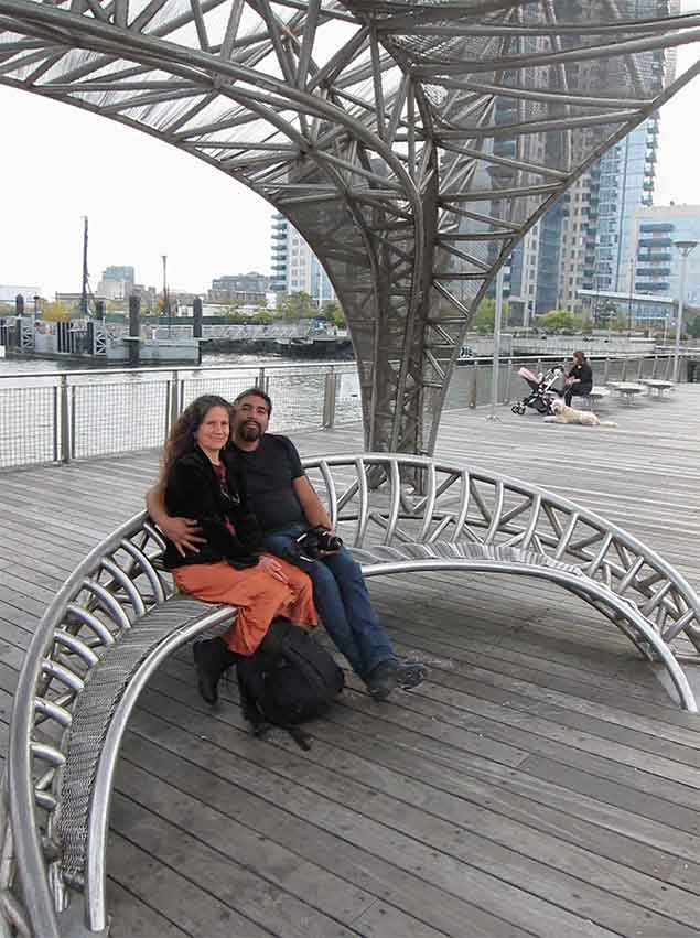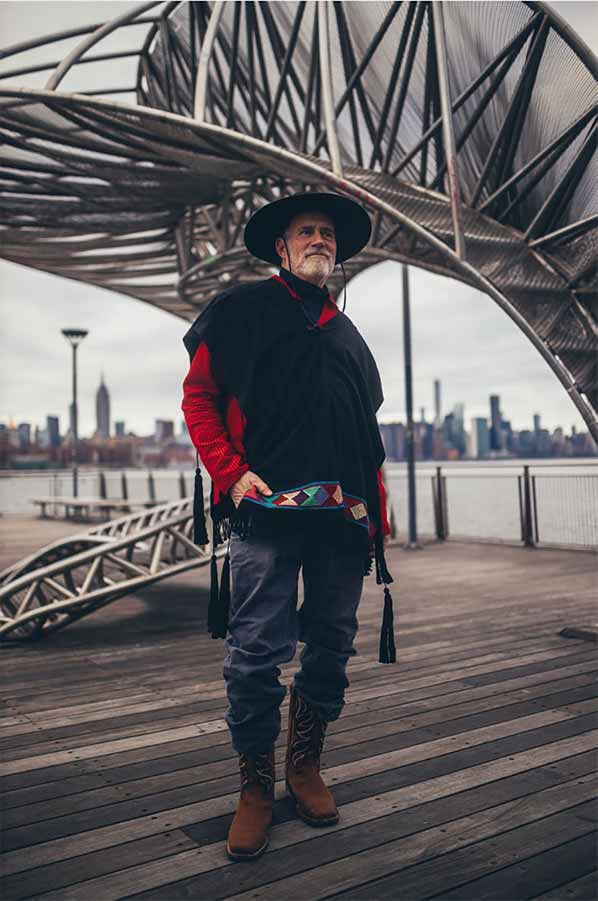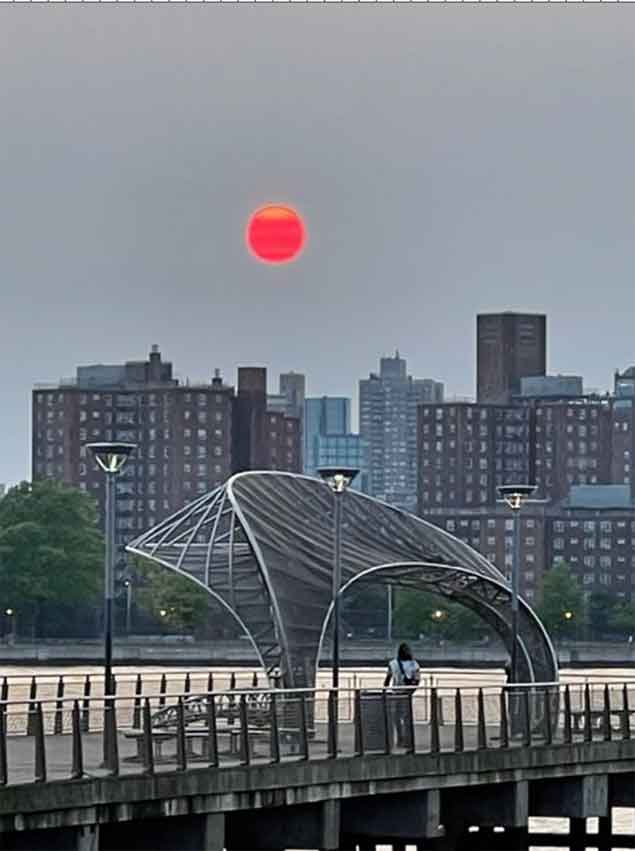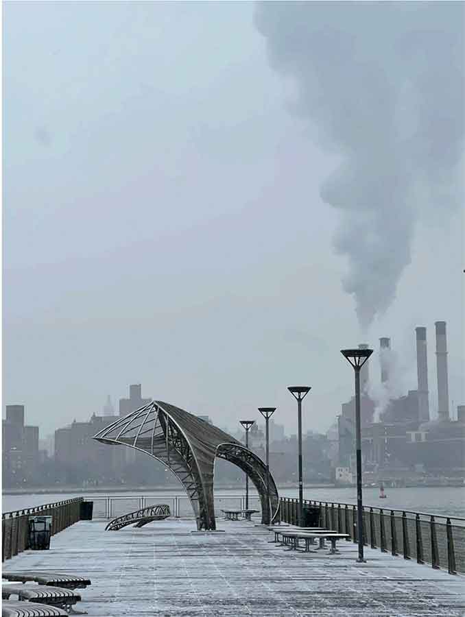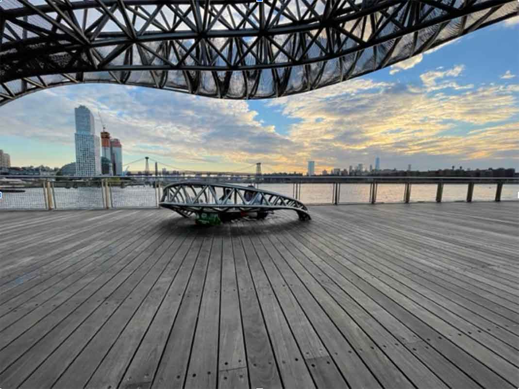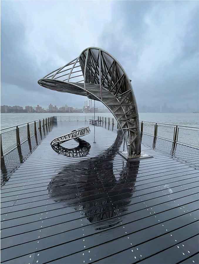 2008 Welded stainless steel pipe sheathed with woven stainless “Niagara” mesh. Permanent installation commissioned by RD Management/ Toll Brothers for the end of their new pier on the East River, adjacent to the esplanade and residential towers. North Fifth Street, Williamsburg, Brooklyn. Overhead structure: 16 x 26’ x 22’ Sculpture/ Bench unit below: 3’ x 15’ x 8’ Deeded with the park to NYC.